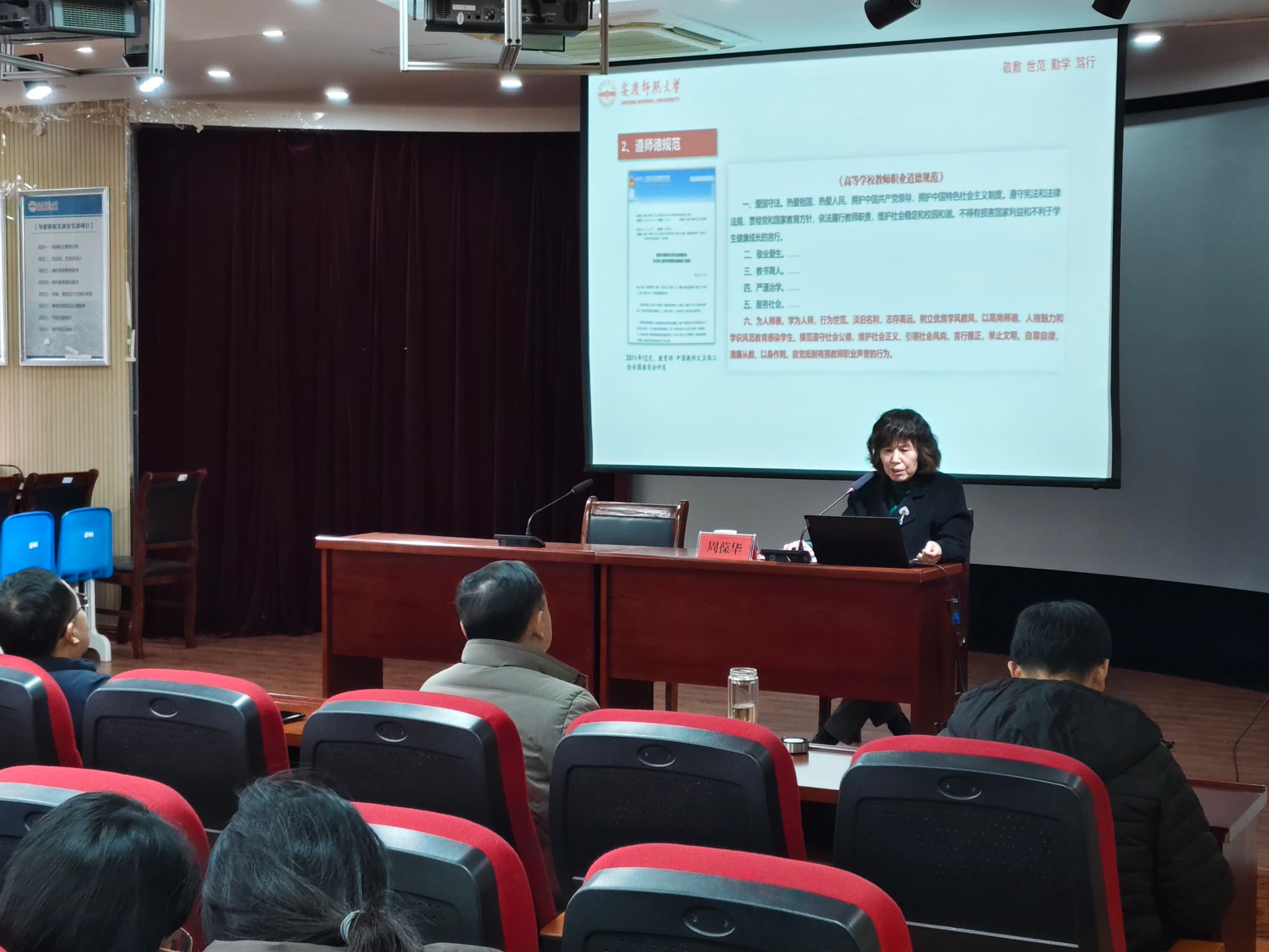 12月11日,太阳成集团tyc151在F411报告厅举办师德师风专题报告会, 2022年公司“三全育人”最美老师之“教书育人”最美老师、校关工委秘书长周葆华教授以“浅谈新时代高校师德师风建设”为主题作报告,公司全体教职员工参加报告会。
