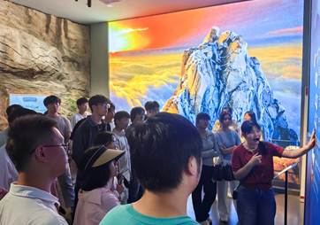 为加深对天柱山的认识,师生先参观了天柱山博物馆,馆内陈列了各类矿物标本、古生物化石及互动式展示设备。通过丰富的展品和详实的资料,同学们深入了解了天柱山独特的地质演变过程及其生态系统的丰富性,使大家对区域环境有了更为直观的认识,进一步激发了同学们对后续实地考察的浓厚兴趣。