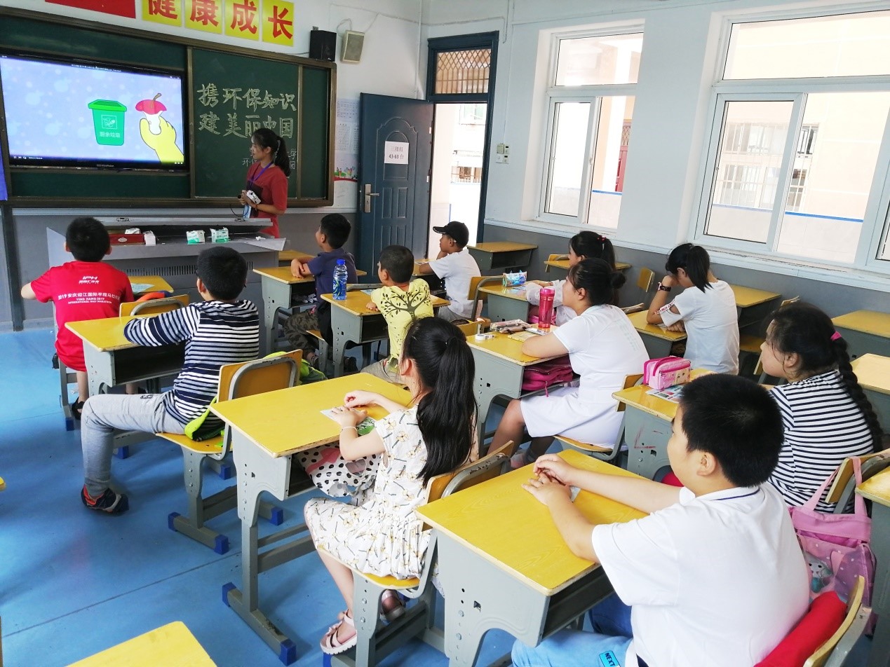 7月10日,“手绘暖阳,筑梦童年”志愿者来到四照园小学,给孩子们普及关于垃圾分类的知识,培养他们爱护环境的意识。