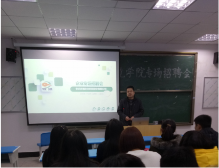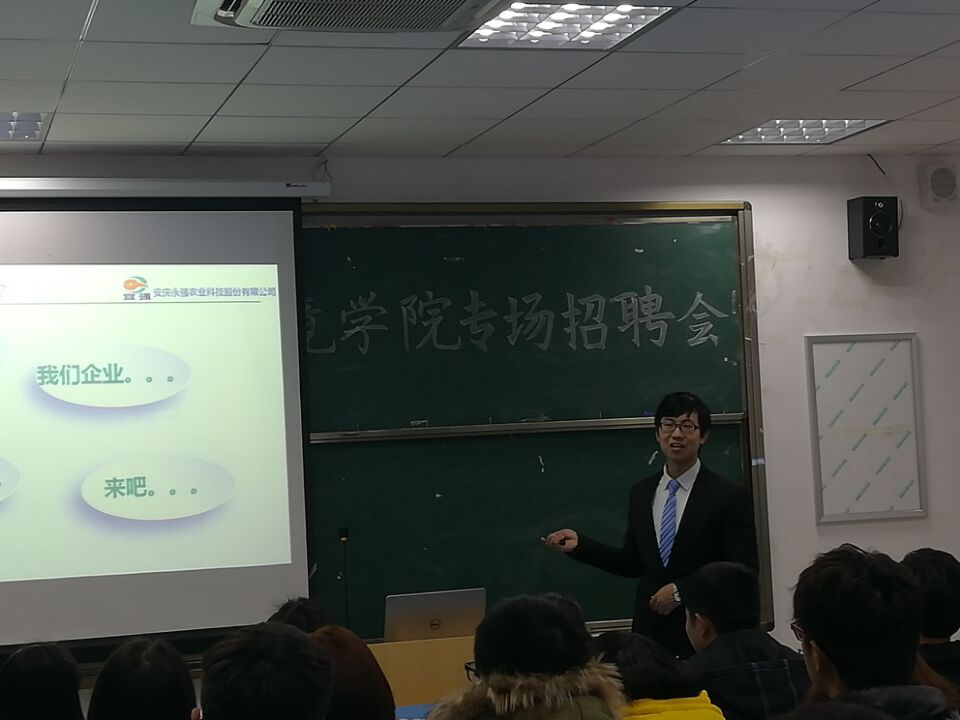 安庆永强农业科技股份有限公司成立于2000年,系“新三板”上市企业,拥有资产数亿元,是集农、科、贸为一体的省级农业化龙头企业。该公司人力资源主管李博从就业指导、职场心态、关于我们等方面进行了宣讲,并与在场的员工就“如何了解一个公司的发展前景”与“如何正确选择自己适合的公司”等问题进行了的交流讨论。