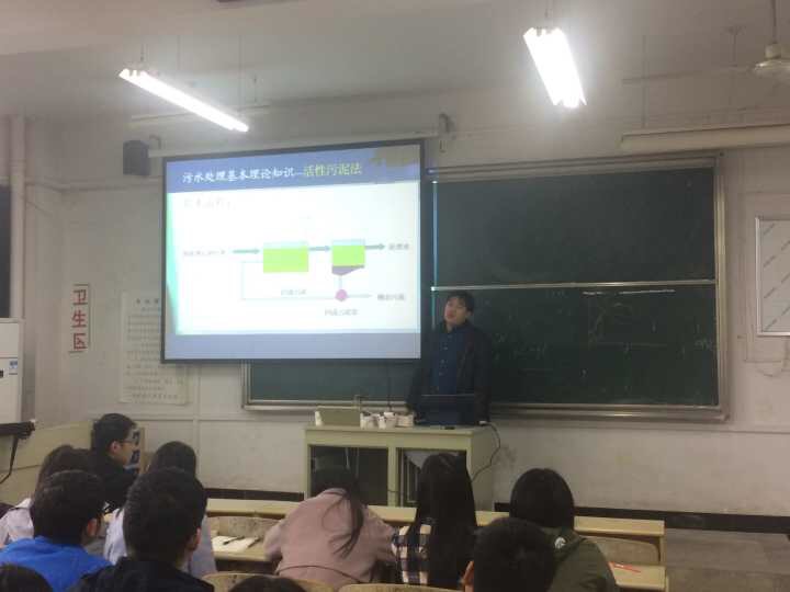 课堂上,两位工程师结合近年来开展的工程设计、施工和管理方面的经验,为同学们详细讲解了环保工程项目建设的主要过程和近年来发展趋势。祝学员工通过设计图纸和环保设施运行数据,生动地讲述了污水处理方法和城镇污水处理厂主要工艺,诙谐的语句,形象的比喻,使得此次讲座取得了良好的授课效果。吴亮工程师通过一些环保工程案例向大家介绍了环保项目的施工与运行、废弃物处理处置等内容,他还结合自己的工作经验,热情地为同学们介绍环保专业的就业领域和具体要求。
