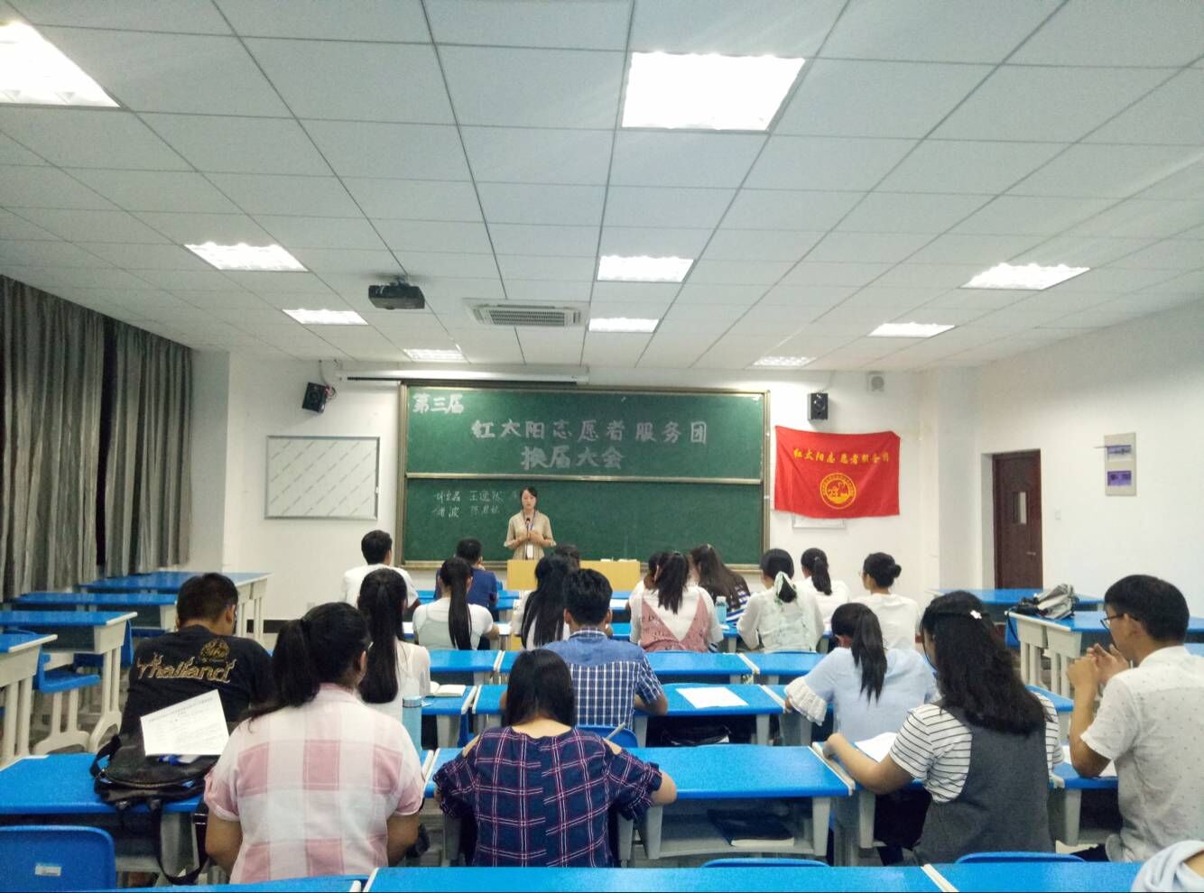 为提高公司志愿服务工作水平,进一步规范和完善公司志愿者工作, 6月8日晚,公司“红太阳”志愿者服务团换届选举大会在F104教室如期举行。公司团总支负责人程亚运老师、服务团团支部副书记李亚寿、会长窦玮以及各部门部长出席本次大会并担任评委。