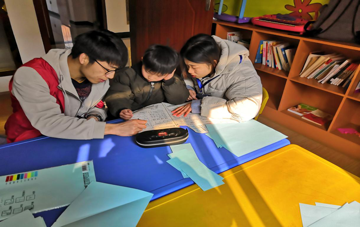 现场还有志愿者的激烈讨论,大家针对“户”字怎么组词展开讨论。“我的第一反应是户口,但是小朋友可能不知道啊。我们还是决定用住户这个词会比较好解释。”志愿者方业平说到。