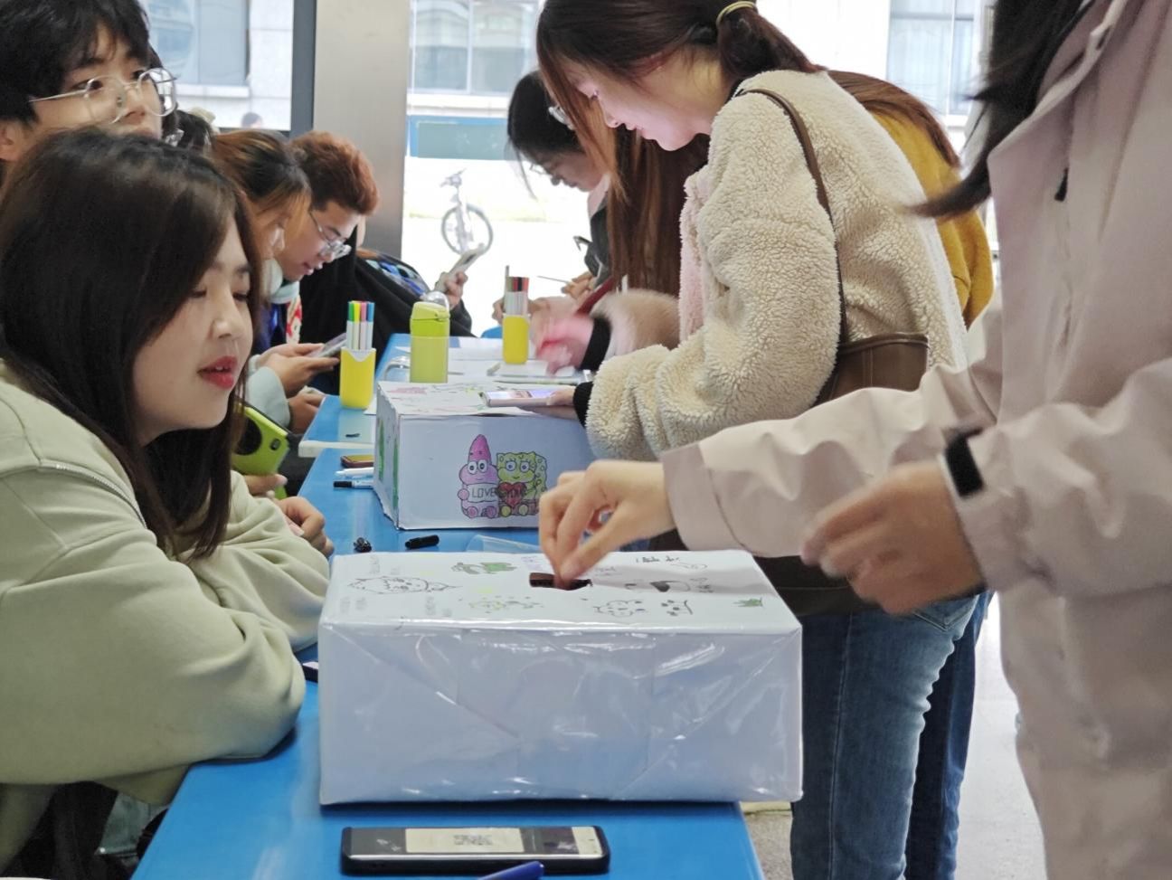 学习压力、人际关系、就业选择……每位同学都面临着不同的情绪难题。在“心灵涂鸦”环节,工作人员事先准备好了一些绘有空瓶子和空垃圾箱图画的纸张。每个参与者可在象征快乐的空瓶子瓶里绘上自己的愉悦心事;也可以在作为负面情绪回收站的的空垃圾箱里填入悲伤情绪。“把快乐装进收集瓶,把悲伤扔进垃圾箱,我身上的负担又轻了些。”来自地理科学专业2022级(2)班的许滢淇同学表示,这种运用艺术表达自己内心世界的方式,不仅给予了大家情绪宣泄的出口,也能使自己更好地认识自己的心理状态,避免潜在的心理问题。