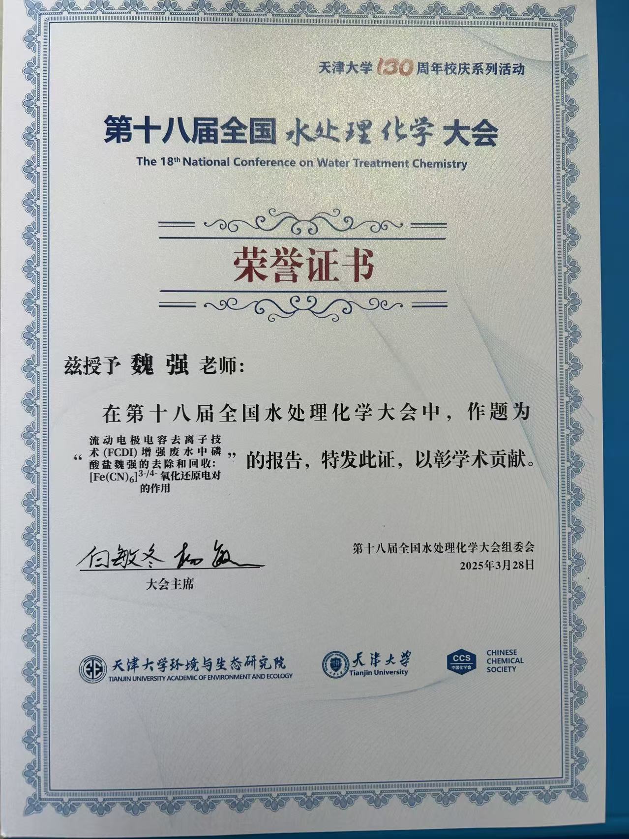2025年3月28日-30日,第十八届全国水处理化学大会暨学术研讨会在天津举办。本次会议由天津大学和中国化学会应用化学学科委员会主办,以“减污降碳扩绿目标愿景下水处理化学的创新发展”为主题,围绕我国生态文明建设和双碳战略需求,深入探讨水处理化学领域新理论、新技术、新装备、新材料和新模式,以减污降碳扩绿的理念引领水处理技术的创新与低碳发展。公司魏强副教授受邀参加该会议,认真聆听了来自天津大学、同济大学、中国科学技术大学、华东理工大学等多所高校专家的主旨报告,并与行业内的知名专家学者进行了深入的学术交流。