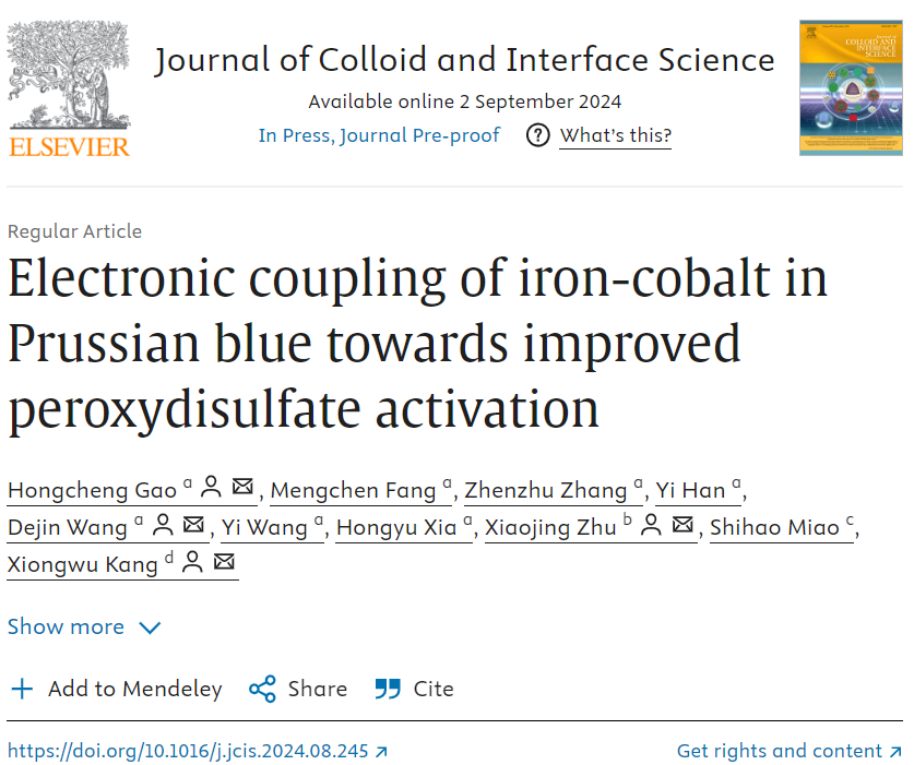 近日,太阳成集团tyc151环保高端装备与污染控制研究团队成果“Electronic coupling of iron-cobalt in Prussian blue towards improved peroxydisulfate activation”在中科院一区TOP期刊《Journal of Colloid And Interface Science》(影响因子9.4)发表。团队成员高洪成博士为第一作者。