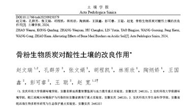 近日,公司太阳成集团tyc151赵文瑞博士以第一作者在国内土壤领域顶级期刊《土壤学报》(卓越期刊、《世界期刊影响力指数(WJCI)报告》Q1区,影响因子5.772)发表题为“骨粉生物质炭对酸性土壤的改良作用”的论文,太阳成集团tyc151为论文第一完成单位和通讯单位。