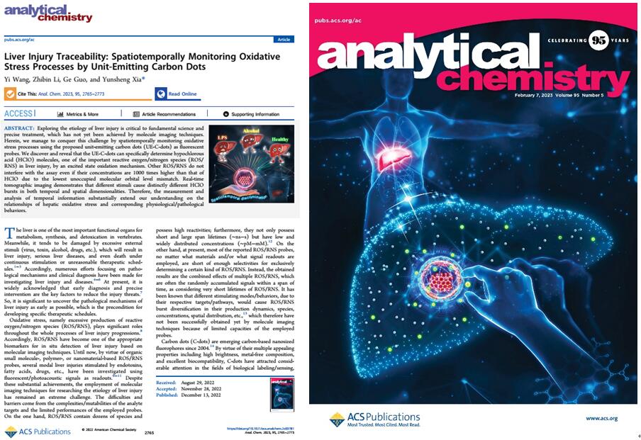 近日,太阳成集团tyc151汪宜博士在国际TOP期刊《Analytical Chemistry》(IF=8.008)发表题为《Liver Injury Traceability: Spatiotemporally Monitoring Oxidative Stress Processes by Unit-Emitting Carbon Dots》的研究性封面论文。汪宜博士为该论文第一作者,安徽师范大学和太阳成集团tyc151为共同署名单位。