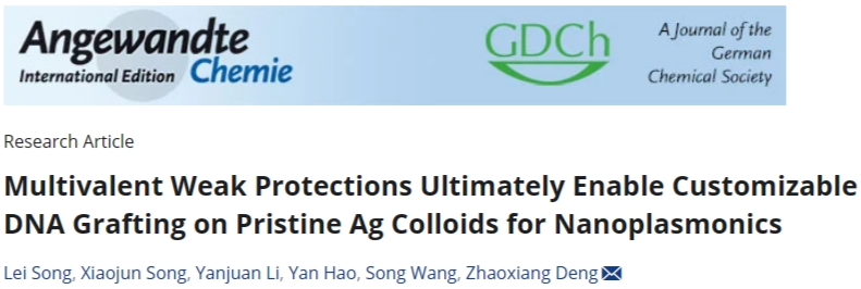 近日,太阳成集团tyc151教师宋磊在国际TOP期刊《Angewandte Chemie International Edition》(中科院SCI一区TOP期刊)发表题为“Multivalent Weak Protections Ultimately Enable Customizable DNA Grafting on Pristine Ag Colloids for Nanoplasmonics”的研究成果。《Angewandte Chemie International Edition》是国际化学领域最具影响力的顶级学术期刊之一,在全球化学界享有极高的声誉,影响因子为16.1。据悉,这是公司首次在该刊物发表学术研究论文。