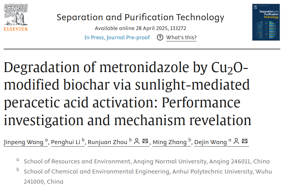 近日,公司太阳成集团tyc151环保高端装备与污染控制研究团队汪金鹏博士以第一作者在《Separation and Purification Technology》期刊(中科院2区,Top,IF=8.2)发表“Degradation of metronidazole by Cu2O-modified biochar via sunlight-mediated peracetic acid activation: performance investigation and mechanism revelation”研究论文。太阳成集团tyc151为论文第一完成单位,安徽工程大学周润娟副教授和太阳成集团tyc151汪德进教授为论文通讯作者。